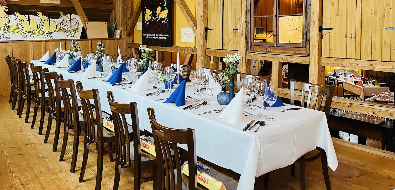 Auf der Hühner-Empore können wir für Sie eine Tafel herrichten für 20-25 Erwachsene Personen (Kinder sind erst ab 12 Jahren erlaubt). Hier sitzen Sie im Märchen von Witwe Boltes Hühner. Dieser Teil lässt sich verbinden mit dem Apéro Teil (Meister Müllers Bäckerei). Bei einer Trauung kann er bespielsweise genutzt werden als Empore für Brautpaare und den Zeremoniegestalter. Oder bei Firmenanlässe eignet sich die Empore hervorragend für Reden oder Ansprachen. Bei grösseren Apéros kann die Empore in den Apéro-Teil integriert werden.